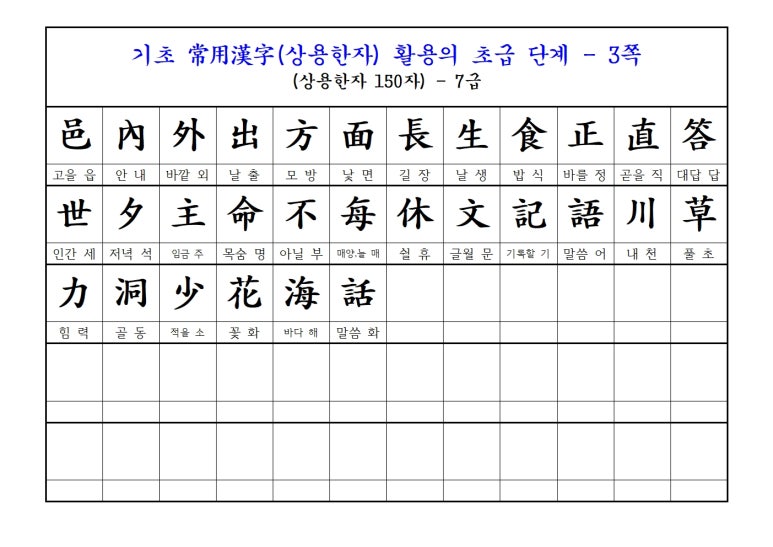 한자능력검정시험의 7급 배정한자를 다운받아 확인해보면, 한자만 잔뜩 나와 있어서 처음 공부하는 사람에게는 꽤 난해하게 느껴질 수 있습니다. 저도 그때를 떠올려 보면 약 15년 전, 처음 공부할 때의 느낌이 여전히 생생하게 기억납니다.
